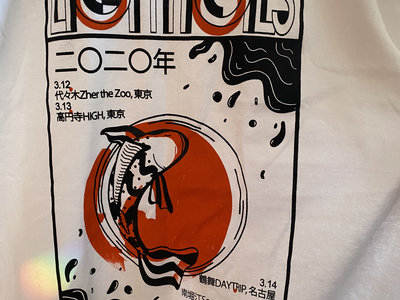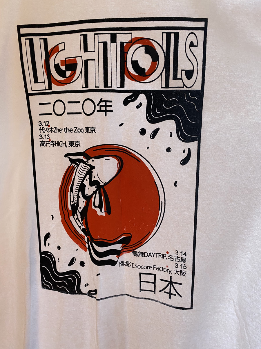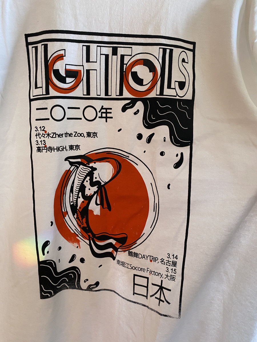 Artwork for the Lightfoils 2020 Japan tour that was cancelled due to Covid-19. Black and orange ink on white Gildan shirt. Screen printed by the band. Imperfect edition.